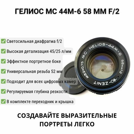Объектив MC Helios-44M-6 - это мануальный советский портретный объектив, выпущенный в 1993 году на Валдайском заводе "Юпитер". Он отлично подходит для портретной съемки на современных зеркальных камерах, благодаря своей светосиле 2.0 и фокусному расстоянию 58мм. Объектив обладает высокой разрешающей способностью линз - 45/25 линий/мм, что обеспечивает четкость и ясность изображения. Цветопередача и пластичность рисунка на высоте, а эффект боке делает изображение еще более привлекательным. Объектив MC Helios-44M-6 оснащен диафрагмой (F) при максимальном фокусном расстоянии 2.0, что позволяет регулировать глубину резкости. Диаметр резьбы для светофильтра составляет 52.0 мм, что позволяет использовать различные фильтры для улучшения качества изображения. Объектив совместим с камерами Canon, Nikon и Sony, что делает его удобным для использования с различными моделями фотоаппаратов. В комплект поставки входит сам объектив, переходник и передняя крышка.