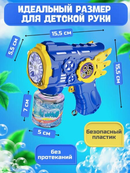 Пистолет генератор мыльных пузырей – топ новинка для веселого времяпровождения как для детей, так и для взрослых дома и на улице, так как никто не откажется пострелять мыльными пузырями! С генератором мыльных пузырей справится любой ребенок, так как имеет простое управление. Необходимо нажимать на кнопку, расположенную на рукояти, тем самым создавая автоматический поток пузырей – пузыри в один клик. А благодаря отверстиям получается большое количество пузырей. Генератор выполнен в виде крутого и удобного пистолета. Усовершенствованная модель детских пистолетов с мыльными пузырями позволяет пользоваться генератором без погружения в мыльную жидкость. А герметичный корпус машины для пускания пузырей предотвращает протечку мыльного раствора, позволяя поворачивать автоматический пистолет в любую сторону на 360 градусов. Поэтому можно смело забыть про липкие руки! Игрушечное оружие подойдёт для сюжетной игры в войнушку, весёлой вечеринки или просто прогулки на природе. С ним любой день заиграет новыми красками! Любой ребенок будет рад за пару секунд создать пышное облако пузырей, поэтому пистолет игрушка отличный подарок детям, ребенку, мальчику, девочке, сыну, дочке на день рождение и другие праздники. Эта детская автоматическая пушка для создания мыльных пузырей, мыльный автомат - крутая развивающая игрушка, с ее помощью ребенок учится быть внимательным, собранным и развивает свое воображение и творческие способности. Игрушечный пистолет работает от 4 батареек типа АА (батарейки в комплект не входят). Мыльный пистолет изготовлен из качественного пластика, нетоксичного материала. Рекомендовано для детей от 3 лет. Хотите вспомнить детство и поднять настроение себе и окружающим? Купите данный пистолет - зарядитесь положительными эмоциями!