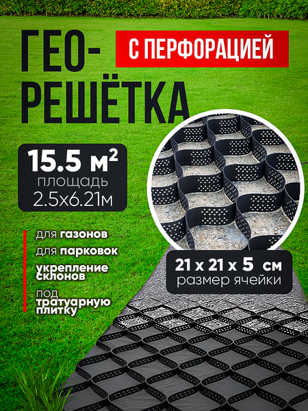 Георешетка с перфорацией 21х21х5см, модуль 2,5х6,21=15,5м2. Георешетка модульный геосинтетик, изготовленный из скрепленных между собой полимерных полос. В развернутом виде модуль объемной георешетки имеет конструкцию сот. Применение: стабилизация сыпучих материалы (не допустить осыпания склона, повысить прочность дорожного полотна, продлить срок эксплуатации различных сооружений из грунта); при строительстве транспортных путей; для коррекции береговых линий водоемов (рек, озер, прудов ); при обустройстве высоких клумб; для армирования водоотводов. За счет большого количества ячеек георешетка уменьшает подвижность грунта, предотвращая его сползание. Склоны и откосы, укрепленные решеткой, не размываются осадками и не дают проседания. Укрепление склонов георешеткой не даст разрастаться оврагу, а ручью размыть берега. Преимущества данной георешетки: высокая прочностью на разрыв; устойчивостью к нагрузкам динамического характера; устойчивость к образованию коррозии; устойчивость к поражению грибком и плесенью; хорошо переносят высокие и низкие температуры; сохраняют целостность при резких температурных перепадах; просто монтируются. Основные преимущества: -Армирование. -Надежное укрепление грунтовых конструкций -Разделение несущих слоев сооружения -Противоэрозийные действия. Для заполнения решетки используют: каменную крошку; песок; гравий; грунт (с растениями или без них); растворы бетона, которые в дальнейшем застывают, образуя прочное основание. Георешетку можно использовать между грядок в теплице как дорожку. Засыпать ее землей или щебнем. Решеткой удобно декорировать площадки возле клумб и мест отдыха. георешетка; укрепление; армирование; для дачи; для сада; садовая дорожка; георешетка объемная; бордюрная лента