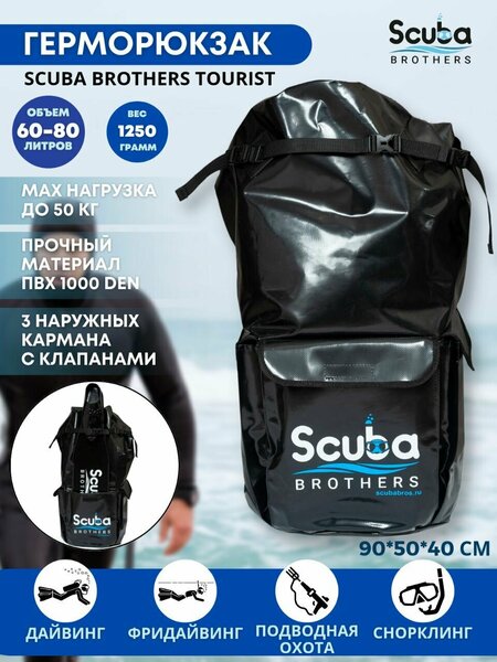 Герморюкзак SCUBA BROTHERS TOURIST 60-80 литров изготовлен из водонепроницаемого прочного материала ПВХ, плотностью 1000 DEN. Основное преимущество этого рюкзака, это его трансформация, в компактном состоянии его объем составляет 60 литров, а в максимальном 80 литров. Внутренний отсек без карманов, вмещает полный комплект снаряжения. Снаружи рюкзак оборудован тремя карманами с клапанами, фронтальный карман предназначен для длинных охотничьих ласт, которые фиксируются лямками. Такая транспортировка ласт убережет Ваше снаряжение от повреждений. Герморюкзак SCUBA BROTHERS TOURIST удобно открывается и сразу предоставляет большой доступ во внутренний отсек. Верхний клапан сумки закручивается и застегивается на фиксирующие клипсы, что полностью предотвращает попадание воды вовнутрь. Сумка имеет удобные для переноски наплечные ремни. Характеристики: Рекомендации по применению: фридайвинг, подводная охота, дайвинг, снорклинг; - материал рюкзака: ПВХ; - материал лямок: парашютная стропа; - застежки: фастекс; - плотность материала, DEN: 1000; - объём, л: 60-80; - габариты Д*Ш*В, см: 90*50*40; - влагостойкость: IPX8; - вес, грамм: 1250; - цвет: черный; - бренд: SCUBA BROTHERS; - страна бренда: Россия; - страна производства: Россия.