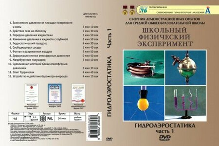 Учебный фильм "Гидроаэростатика ч.1" представляет собой видеосборник демонстрационных опытов по физике для средней общеобразовательной школы. В учебный фильм включены 12 опытов: 1. Зависимость давления от площади поверхности и силы – 3 мин. 10 сек. 2. Действие газа на оболочку – 2 мин. 30 сек. 3. Передача давления жидкостями – 1 мин. 50 сек. 4. Изменение давлении в жидкости с глубиной – 3 мин. 50 сек. 5. Гидростатический парадокс – 4 мин. 30 сек. 6. Сообщающиеся сосуды – 1 мин. 40 сек. 7. Фонтан в разреженном воздухе – 2 мин. 50 сек. 8. Деформация пленки атмосферным давлением – 0 мин. 50 сек. 9. Магдебургские полушария – 2 мин. 40 сек. 10. Сдавливание жестяной банки атмосферным давлением – 3 мин. 30 сек. 11. Опыт Торричелли – 4 мин. 40 сек. 12. Устройство и действие барометра-анероида – 4 мин. 10 сек. Продолжительность: 36 мин. Формат: DVD-video.