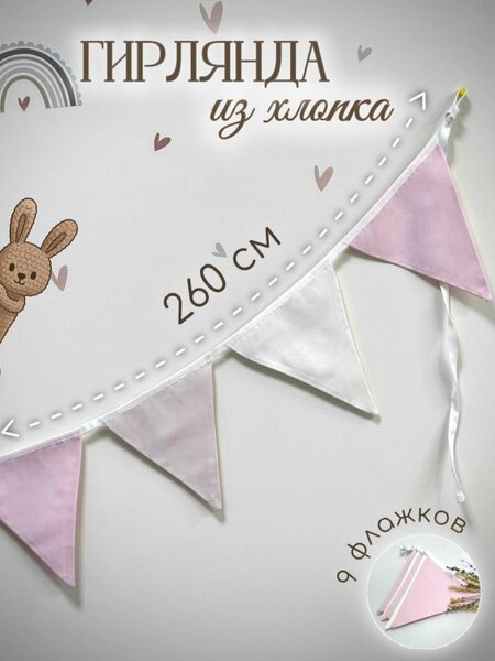 Гирлянда баннер из тканевых флажков. Выполнена из 100% хлопка. Текстильную гирлянду из флажков можно использовать для декора детской комнаты, спальни, гостиной, кенди-бара и при оформлении дня рождения, праздника, а также как стильный декор для дома в стиле Сканди. Гирлянда на стену станет отличным дополнением к оформлению детского уголка, подарком ко дню рождения малыша. Вы можете подобрать у нас текстиль для детской комнаты в одном цветовом решении. Текстильная гирлянда состоит из 9 флажков размером 15см*19см. Общая длина гирлянды 260см вместе с завязками, часть с флажками 1,55м, каждая завязка по 50см. Стирка при 30 градусах на деликатном режиме, режим для утюга -хлопок. Не рекомендуется стирать вместе с синтетическими изделиями и полотенцами.