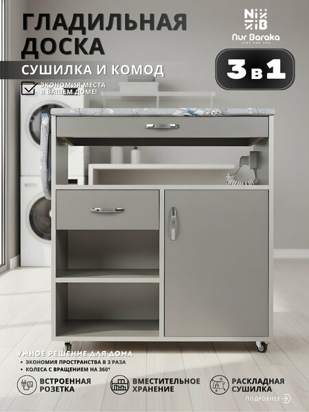 Гладильная доска удобно выдвигается и надежно фиксируется, обеспечивая комфорт и безопасность во время глажки. Рабочая поверхность ровная и устойчивая, подходит для глажки одежды, постельного белья и текстиля разных размеров. После использования доска легко убирается внутрь, освобождая место в комнате. Комод оснащён выдвижным ящиком для хранения утюга, аксессуаров и мелких принадлежностей, а также несколькими полками для аккуратного размещения белья, полотенец и других вещей. Дверца открывается плавно, обеспечивая удобный доступ к внутреннему пространству. Конструкция выполнена из прочных и износостойких материалов, рассчитанных на ежедневное использование. Компактные габариты и мобильность позволяют легко разместить изделие в любой части дома. Гладильный комод станет отличным выбором для тех, кто ценит функциональность, порядок и комфорт в быту.