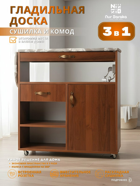 Гладильная доска удобно выдвигается и надежно фиксируется, обеспечивая комфорт и безопасность во время глажки. Рабочая поверхность ровная и устойчивая, подходит для глажки одежды, постельного белья и текстиля разных размеров. После использования доска легко убирается внутрь, освобождая место в комнате. Комод оснащён выдвижным ящиком для хранения утюга, аксессуаров и мелких принадлежностей, а также несколькими полками для аккуратного размещения белья, полотенец и других вещей. Дверца открывается плавно, обеспечивая удобный доступ к внутреннему пространству. Конструкция выполнена из прочных и износостойких материалов, рассчитанных на ежедневное использование. Компактные габариты и мобильность позволяют легко разместить изделие в любой части дома. Гладильный комод станет отличным выбором для тех, кто ценит функциональность, порядок и комфорт в быту.