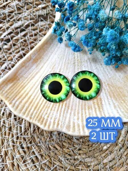 Глаза крупные - 25мм! В наборе 1 пара глаз (2 штуки). Глаза НЕсамоклеящиеся, белую подложку НЕ отдирать! Приклеивать на клей, подходящий к материалам изделия, или запекать с полимерной глиной. Стеклянные глазки очень красивые, а четкая линза позволяет получить неповторимый эффект живого глаза, поэтому глаза из стекла оживят Ваши творения и вдохнут жизнь в Ваши творческие работы. Фурнитура для игрушек подойдет для любого вида творчества. Стеклянные кабошоны - прекрасный материал и аксессуар для рукоделия, который станет отличным подарком для рукодельницы. Будем рады Вас видеть среди покупателей в нашем магазине FRESH MARKET!