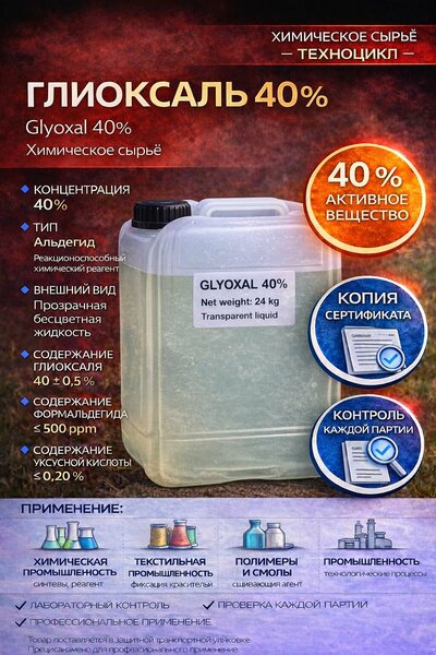 Глиоксаль 40% (Glyoxal 40%) Описание: Глиоксаль — это водный раствор, содержащий 40% альдегидов, представленный прозрачной или слегка желтоватой жидкостью с характерным запахом. Активно используется в текстильной, бумажной и химической промышленности, а также при производстве антисептических и дезинфицирующих средств. Благодаря своей высокой реакционной способности, глиоксаль является важным компонентом для перекрестного сшивания полимеров и модификации различных материалов. Химическая формула: C₂H₂O₂ Рег. номер CAS: 107-22-2 Физико-химические свойства: