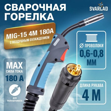 Сварочная горелка MIG-15 4м предназначена для сварки MIG/MAG при подключении к аппаратам полуавтоматической сварки для выполнения различного вида сварочных работ. Удобная рукоятка с кнопкой управления сварочным процессом и эргономичный дизайн горелки обеспечивают максимальный комфорт во время работы. Шарнирное соединение рукоятки и рукава снижает нагрузку на кисть и запястье. технические характеристики: ПВ при максимальном токе, %: 60 Тип охлаждения: воздушное Максимальный сварочный ток MIX (Ar/CO2), А: 150 Максимальный сварочный ток CO2, А: 180 Процесс сварки: MIG/MAG Тип разъёма подключения: евро Управление горелкой: кнопка Длина рукава горелки, м: 4 Диаметр проволоки, мм: 0,6 / 0,8
