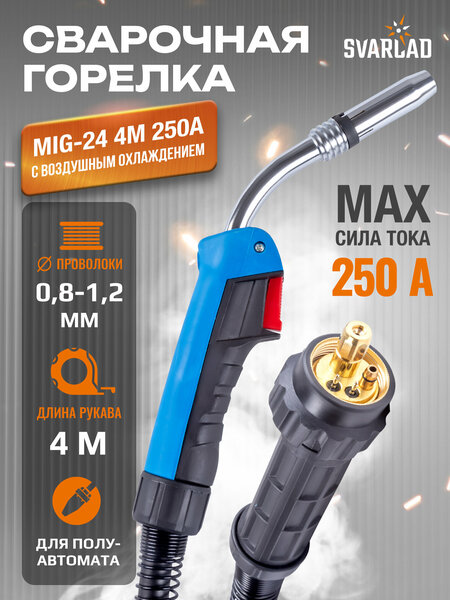 Сварочная горелка MIG-24 4м предназначена для сварки MIG/MAG при подключении к аппаратам полуавтоматической сварки для выполнения различного вида сварочных работ. Удобная рукоятка с кнопкой управления сварочным процессом и эргономичный дизайн горелки обеспечивают максимальный комфорт во время работы. Шарнирное соединение рукоятки и рукава снижает нагрузку на кисть и запястье. технические характеристики: • ПВ при максимальном токе, %: 60 • Тип охлаждения: воздушное • Максимальный сварочный ток MIX (Ar/CO2), А: 220 • Максимальный сварочный ток CO2, А: 250 • Процесс сварки: MIG/MAG • Тип разъёма подключения: евро • Управление горелкой: кнопка • Длина рукава горелки, м: 4 • Диаметр проволоки, мм: 0,8 / 1,0 / 1,2