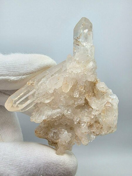 Щётка кристаллов горного хрусталя. Месторождение: Россия. Размер 73х51х35 мм. Вес 51 г. Горный хрусталь — минерал, чистый природный диоксид кремния, бесцветная прозрачная разновидность кварца, одна из кристаллических модификаций кремнезёма. Чистые бездефектные кристаллы горного хрусталя встречаются относительно редко и высоко ценятся. Трудно назвать камень из безграничной семьи самоцветов, который был бы так безупречно чист, так безукоризненно прозрачен, имел бы совершенный лучезарный блеск, как горный хрусталь. В исторической древности горный хрусталь принимали за застывший лед, так как находили его высоко в горных массивах, где лежат вечные снега, да и сама "холодность" самоцвета служила тому. Прозрачные кристаллы бесцветного кварца с давних пор привлекали людей. Подходит по гороскопу: овнам, водолеям, весам. Камень натуральный, поэтому может иметь естественные трещинки, включения, неровности поверхности, рисунка, цвета, что подтверждает и подчеркивает его природное происхождение. Цвет на фото может несколько отличаться от цвета в реальности за счет разных настроек мониторов и особенностей освещения при фотографировании.