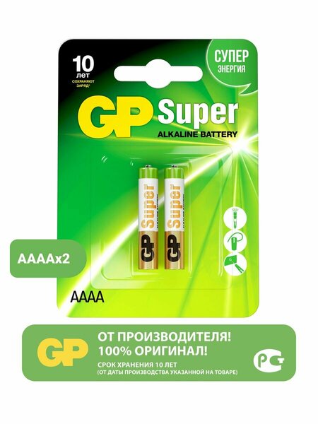 Батарейки Super Alkaline бренда GP - это универсальный и надежный источник питания для различных электронных устройств. Они работают безупречно в самых разных ситуациях, делая вашу технику по-настоящему эффективной. Батарейки типоразмера AAAA ( 4А ) обладают высокой энергоемкостью и напряжением 1.5 В. Современные гаджеты стали неотъемлемой частью нашей жизни: MP3-плееры, часы, цифровые камеры, энергоемкие электро аппараты; фотоаппараты, фотовспышки, микрофоны, игровые консоли; фонари, смарт-часы, бытовые весы, детекторы дыма; радионяни, радиоуправляемые модели разных типов - все они нуждаются в энергии. Комплект 2 штуки мощных щелочных батарей отличного качества обеспечивает высокую производительность и эффективное использование беспроводного гаджета дома, позволяя наслаждаться играми и аудио. Такая новинка также идеальна для детских игрушек и пультов для них: автомобилей на радио управлении, игрушечных роботов и других. Разовая батарейка мизинец мини - это не только надежное питание для приборов, но и супер выбор для качественной работы электроники. Премиум ( premium ) батареи одноразки справятся с любыми задачами. Это также хороший подарок ( подарочный набор ) на праздники, который оценят мужчины и женщины, парни и девушки всех возрастов. Официальная продукция GP оригинал отличается экономичностью и долговечностью. Щелочной наполнитель имеет низкий саморазряд, устойчивость к окислению. При производстве не используются вредные вещества. Экологичность продукции при ее эксплуатации и утилизации — один из приоритетов компании GP. Питательные элементы хорошо переносят как низкие, так и высокие температуры, что допускает их использовать во внешних девайсах, например в автомобильных ключах, которые могут подвергаться экстремальным температурам в зимнее или летнее время. При установке одноразовых батареек в прибор следует строго соблюдать полярность. Также нельзя их паять и деформировать. После завершения использования следует сдать батарейки в специальные пункты приема.