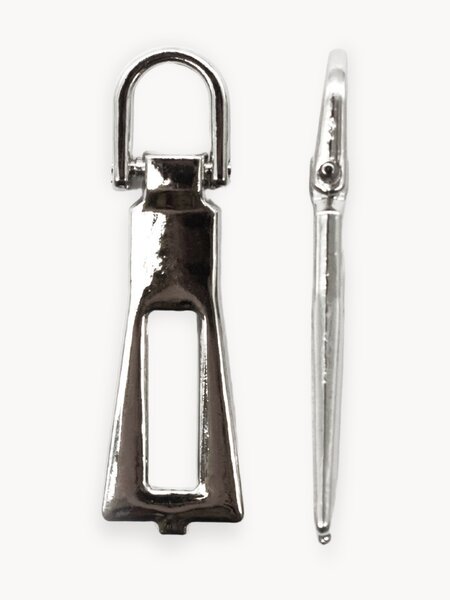 Пуллер для слайдера на молнию изготовлен из металла высокого качества, прочный, не гнется, выдерживает стирку, химическую чистку и другие стандартные нагрузки. Имеет стильную конструкцию и выглядит современно, может служить элементом дизайна. Подвеска такой формы удобна для верхней или спортивной одежды, сумок. При желании проденьте шнур или подвеску в специальное отверстие. Удачно сочетается с различными молниями – металлическими, витыми и тракторными. Подходит для ремонта и замены. Размер: 12х40 мм. Цена за 10 шт.
