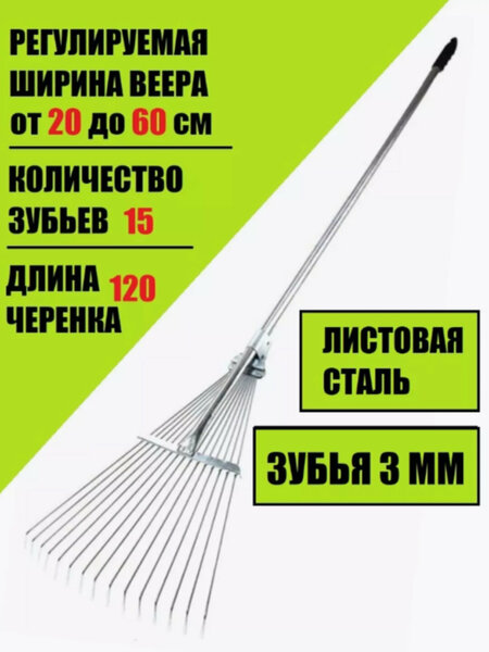 Надёжные садовые лёгкие металлические веерные грабли с черенком. Грабли для газона и сена, аэраторы раздвижные и регулируются по длине и ширине веера. Удобный садовый инвентарь, прочный с надёжными креплениями незаменим на приусадебных участках, в парковых зонах, детских площадках, общественных местах и офисах для уборки прилегающей территории. Универсальный ручной инструмент удобен для обработки почвы, сбора листьев, для удаления сорняков, скошенной травы и прочего садового мусора. Штыревые железные металлические грабли-трансформеры регулируются по ширине веера от 20 см до 60 см и надёжно фиксируются, поэтому ими можно собирать не только крупный, но и мелкий мусор. Механизм стопора сделан на заклепке, в отличие от грабель которые скреплены болтом с гайкой, наиболее надежен. Работать таким инструментом одно удовольствие.