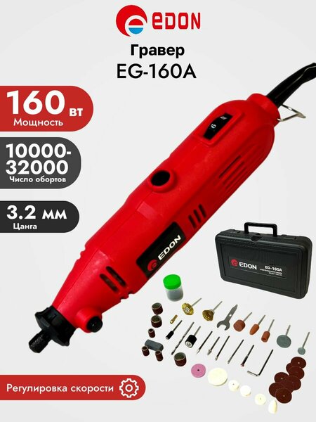 Электрический гравер EDON применяется для обработки твёрдых и мягких материалов. Имеет обрезиненную рукоятку для надежного удержания при работе. Блокировка шпинделя обеспечивает быструю замену оснастки. Гравер предназначен для выполнения широкого спектра работ, таких как: резка, сверление, полирование, гравирование, фрезерование и зачистка. Модель укомплектована большим количеством аксессуаров. Преимущества гравера EDON