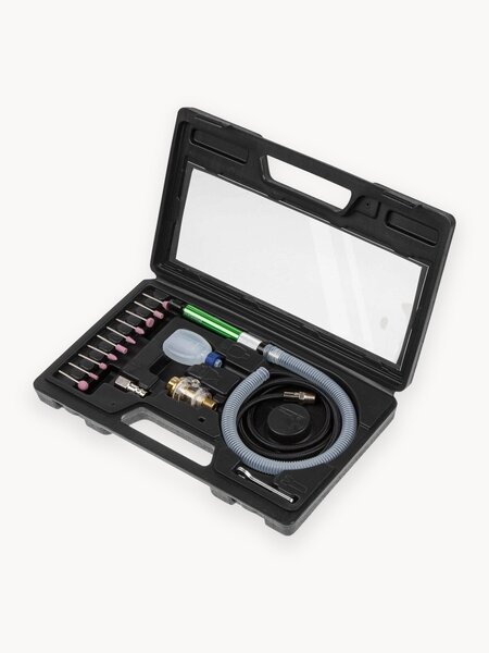 Гравер пневматический ECO AGV-55A - это профессиональный инструмент, который сочетает в себе функции шлифовки, полировки и удаления заусенцев. Он станет незаменимым помощником как для профессионалов, так и для любителей. Инструмент оснащен цанговым патроном на 3 мм (1/8"), что позволяет использовать различные насадки и обеспечивает надежное крепление. Частота вращения составляет 54000 об/мин, а рабочее давление - 6,3 атм. Расход воздуха составляет 60 л/мин, что делает его экономичным в использовании. Гравер поставляется в удобном пластмассовом чемодане, который обеспечивает безопасную и компактную транспортировку. В комплект входят 10 шлифкамней с хвостовиком 3 мм, монтажный ключ (2 шт.), маслораспылитель, масленка, ниппель и другие аксессуары. Цвет товара - черный с зеленым, что придает ему стильный и современный вид. Частота вращения: 54000 об/мин; Рабочее давление: 6,3 атм; Расход воздуха: 60 л/мин; Размер цанги: 3 мм; Присоединительный размер: наружная резьба 1/4"; Цвет товара: черный/зеленый; Кейс: Да; Тип: гравер; Вес: 0.2 кг.