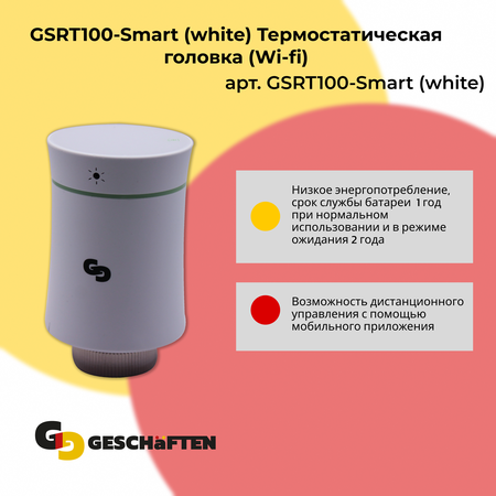 Головка термостатическая с электронной регулировкой Geschaften GSRT100-Smart Wi-Fi (белая) устанавливается на радиаторы для обеспечения комфортной температуры в помещении. Основные характеристики: Светодиодный дисплей Цветной дисплей Низкое энергопотребление, срок службы батареи составляет 1 год при нормальном использовании и в режиме ожидания 2 года Подключение М30х1,5 В комплект входят дополнительные пластиковые адаптеры подключения: адаптер RA; адаптер RAV; адаптер RAVL; адаптер Comap ; адаптер T+A Herz; адаптер Herz Диаграмма температурной кривой в приложении Доступны в цветах: белый, черный Инструкция по монтажу и настройкам входит в комплект. Управление по Wi-Fi настраивается с помощью приложения "Smartlife", которое можно загрузить как для Android, так IOS или по QR-кодам в инструкции.