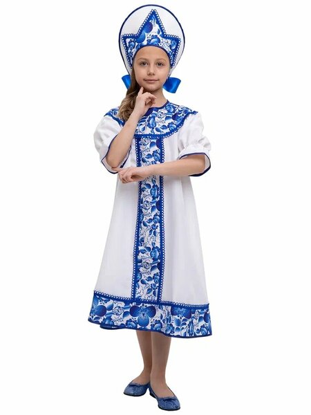 Представляем вам нашу новинку – карнавальный костюм “Гжель Хороводная”, вдохновленный изящной красотой знаменитой гжельской росписи! Этот наряд станет прекрасным выбором для любого праздника и позволит вашей девочке окунуться в мир русских народных традиций. Замеры (см): Длина изделия: 73 Ширина по груди (полуобхват): 38 Длина рукава: 22 Костюм “Гжель Хороводная” – это сочетание элегантности, комфорта и неповторимого русского стиля! Особенности костюма: Платье свободного кроя: Платье широкого кроя идеально подойдет девочкам разной комплекции, обеспечивая комфорт и свободу движений. Оригинальный гжельский узор: Уникальный гжельский узор, разработанный нашими мастерами и нанесенный на ткань, делает этот костюм по-настоящему особенным и запоминающимся. Удобный и красивый кокошник: Оригинальный кокошник, украшенный в стиле гжельской росписи, надежно фиксируется под волосами большим бантом и прекрасно держит форму, завершая образ русской красавицы. Преимущества: Универсальный крой: Подходит для девочек разной комплекции. Уникальный дизайн: Оригинальный гжельский узор, созданный нашими мастерами. Комфорт: Платье не сковывает движения, позволяя активно участвовать в праздничных мероприятиях. Безопасность: Использованы качественные и безопасные материалы. Простота ухода: Легко стирается и гладится. Запоминающийся образ: Ваша девочка будет выглядеть неповторимо на любом празднике. Подарите своей девочке волшебный праздник с карнавальным костюмом “Гжель Хороводная”! Пусть она почувствует себя настоящей русской красавицей, окутанной очарованием и красотой русских народных традиций!