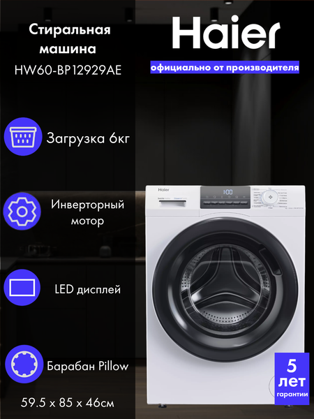{"widgets":{"@card/UniversalPromoBadge":{"/content/page/fancyPage/universalPromoBadge":{"wrapperProps":{"margins":{"bottom":"3"}},"initialTime":1772270991587,"offerComposeId":"1293802744"}}},"meta":{"/content/page/fancyPage/universalPromoBadge":{"name":"@card/UniversalPromoBadge"}},"collections":{"productServiceSnippets":{"1293802744":{"productSnippet":{"snippetId":"document_id","type":"MODEL_CARD_LAYOUT","productPayload":{"snippetStyle":"NORMAL","title":{"value":"Стиральная машина Haier HW60-BP12929AE, 60 см, загрузка 6 кг, A+++"},"badges":{},"gallery":{"mediaItems":[{"picture":{"baseUrl":"https://avatars.mds.yandex.net/get-mpic/200316/2a0000019ae545f95693ed0bb5f49c860329/","width":1080,"height":1440,"title":"Стиральная машина Haier HW60-BP12929AE, 60 см, загрузка 6 кг, A+++"},"type":"IMAGE"},{"picture":{"baseUrl":"https://avatars.mds.yandex.net/get-mpic/5212780/2a0000018e95900fc7ab8ed5eb81c8ad8f37/","width":1598,"height":2000,"title":"Стиральная машина Haier HW60-BP12929AE, 60 см, загрузка 6 кг, A+++"},"type":"IMAGE"},{"picture":{"baseUrl":"https://avatars.mds.yandex.net/get-mpic/12633564/2a0000018e093a5e22531c00a14e2574d82d/","width":600,"height":450,"title":"Стиральная машина Haier HW60-BP12929AE, 60 см, загрузка 6 кг, A+++"},"type":"IMAGE"},{"picture":{"baseUrl":"https://avatars.mds.yandex.net/get-mpic/12366926/2a000001906e2c49fd7f13e67eb4337e2231/","width":1200,"height":1200,"title":"Стиральная машина Haier HW60-BP12929AE, 60 см, загрузка 6 кг, A+++"},"type":"IMAGE"},{"picture":{"baseUrl":"https://avatars.mds.yandex.net/get-mpic/12281369/2a000001906df4fcd5672490fe4319d07203/","width":1300,"height":1300,"title":"Стиральная машина Haier HW60-BP12929AE, 60 см, загрузка 6 кг, A+++"},"type":"IMAGE"},{"picture":{"baseUrl":"https://avatars.mds.yandex.net/get-mpic/12256862/2a000001906df4fcd4457fb057b4a8609817/","width":1300,"height":1300,"title":"Стиральная машина Haier HW60-BP12929AE, 60 см, загрузка 6 кг, A+++"},"type":"IMAGE"},{"picture":{"baseUrl":"https://avatars.mds.yandex.net/get-mpic/12025833/2a000001906e2c49f8aa87168b123134f0b0/","width":1200,"height":1200,"title":"Стиральная машина Haier HW60-BP12929AE, 60 см, загрузка 6 кг, A+++"},"type":"IMAGE"},{"picture":{"baseUrl":"https://avatars.mds.yandex.net/get-mpic/12152435/2a000001906decc0976335cc01cc6c808f4d/","width":1200,"height":1200,"title":"Стиральная машина Haier HW60-BP12929AE, 60 см, загрузка 6 кг, A+++"},"type":"IMAGE"}]},"rating":{"ratingValue":4.8,"ratingCount":572,"reviewsCount":213,"ratingCountStats":{"cnt1":19,"cnt2":3,"cnt3":11,"cnt4":21,"cnt5":518},"snippet":{"rating":"4.8","type":"product","description":"(572) · 1.9K купили","descriptionList":["(572)","1.9K купили"],"ratingStar":"5"}},"wishlistButton":{"businessId":82994844,"mskuId":102829308593,"modelId":1103078949,"oskuId":103200784963},"productRating":{"rating":"4.8","type":"product","description":"(572) · 1.9K купили","descriptionList":["(572)","1.9K купили"],"ratingStar":"5"}},"baobabPayload":{"type":"offer","wareId":"uniq_103200784963","modelId":1103078949,"marketSku":"102829308593","snippet_type":"product","isExpress":false,"isUltima":false,"oskuId":103200784963,"snippetTheme":"GRID_FULL","rating":{"rating":"4.8","purchaseCount":"1967","gradesCount":"572","ratingType":"product"}},"themeType":"GRID_FULL"}}}}}