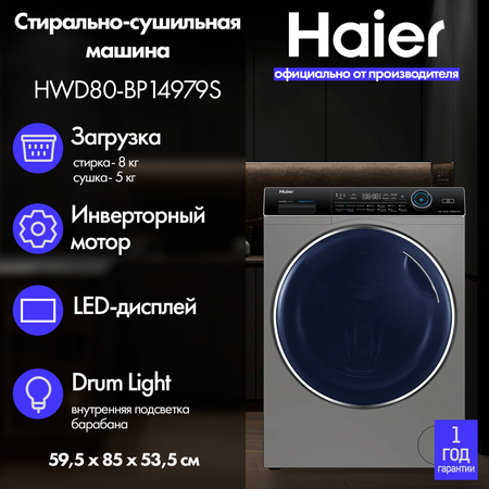стиральная машина с сушкой haier hwd80-bp14979s серая, загрузка 8кг, сушка 5