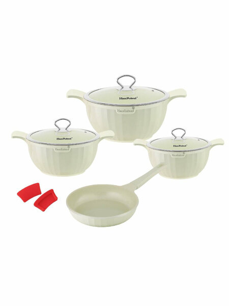 ✨ Набор посуды Haus Roland 4 предмета — современный и надёжный выбор для вашей кухни ! В комплект входят: 3 кастрюли и 1 сковорода . Объём кастрюль: 8.6 Л | 6.9 Л | 5.4 Л Сковорода: 3.7 Л Цвета: белый и чёрный Крышки: стеклянные + жаропрочные Преимущества: ✅ Антипригарное покрытие ✨ — еда не пригорает ✅ Лёгкая очистка ✅ Разные размеры — удобно для любых блюд ✅ Прочная и долговечная ✅ Современный дизайн — стиль для вашей кухни ✨ С этим набором вы легко приготовите суп , плов , рагу , жаркое и другие любимые блюда вкусно и быстро!