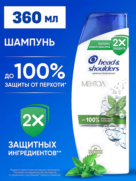 Шампунь против перхоти Head & Shoulders (Хэд энд Шолдерс) со свежим ароматом Ментола подходит для всех типов волос и кожи головы. Обеспечивает до 100% защиты от перхоти*. Эффективен даже против стойкой перхоти. Обновленная формула с активным ингредиентом Пироктон Оламином удаляет как видимую, так и невидимую перхоть, доставляя в поры в 2Х больше защитных ингредиентов. Клинически проверенная и дерматологически протестированная pH-сбалансированная формула делает волосы и кожу головы чистыми и свежими. Шампунь для мужчин женщин для ежедневного использования с формулой Баланса микробиома устраняет основную причину возникновения перхоти и поддерживает сбалансированный микробиом кожи головы. Увлажняющий шампунь для волос уменьшает проблемы и увлажняет кожу головы, избавляя волосы и кожу от перхоти. Для оптимального результата использовать при каждом мытье головы. Способ применения: Нанесите шампунь на волосы. Вспеньте, затем смойте водой. Шампунь подходит для сухой кожи головы и жирной кожи головы. *видимая перхоть, при регулярном использовании