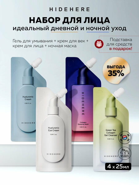 Подарите своей коже необходимый уход и заботу с набором для лица от HIDEHERE. Этот комплексный набор предназначен для глубокого увлажнения, питания и восстановления вашей кожи. В набор входят 4 пауч-флакона по 25 мл, что позволяет использовать его как в дневное, так и в ночное время. 1. Гель для умывания лица – это мягкое и эффективное средство для ежедневного ухода за кожей любого типа. Формула, обогащенная яблочными аминокислотами, AHA-кислотой и гидролизованным коллагеном, бережно очищает кожу от загрязнений, одновременно увлажняя и предотвращая появление акне. Способ применения: небольшое количество вспеньте с водой. Нанесите на влажную кожу, помассируйте, избегая области вокруг глаз. Смойте. 2. Увлажняющий крем – увлажняет, придает сияние и свежесть, устраняет сухость и раздражения. Подходит для чувствительной и обезвоженной, жирной и сухой кожи. Средство выравнивает тон и рельеф кожи, разглаживает морщины, ускоряет омоложение и подтягивает контур. Способ применения: нанесите обильное количество на чистую кожу лица. 3. Крем для глаз и век – его легкая текстура быстро впитывается, глубоко увлажняя и питая кожу, делая ее более упругой и эластичной. Формула крема обогащена гиалуроновой кислотой, пептидами и маслом ши, которые эффективно разглаживают морщины и предотвращают появление новых. Благодаря универсальному применению, крем подходит как для дневного, так и для ночного ухода. Способ применения: нанесите обильное количество на чистую кожу лица. 4. Ночная несмываемая маска для лица станет незаменимым помощником в уходе за вашей кожей. Ее богатая формула, обогащенная глицерином, коллагеном, гиалуроновой кислотой и экстрактами лаванды и центеллы азиатской, глубоко увлажняет, восстанавливает и питает кожу в течение всей ночи. Чтобы маска сработала еще более эффективно, рекомендуем наносить её за полчаса или за час до сна. Утром можно просто умыться прохладной водой.