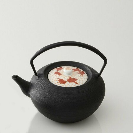 Заварочный чайник Hiratsubo из чугуна, фарфоровая крышка с изображением золотых рыбок. Размер L. Изделие отличает шершавая поверхность сунахада снаружи, слой фарфора внутри дополнительно защищает от коррозии. Чайник идеально подойдёт для чаепития компании из шести человек. Изготовлено в Японии. Материалы: чугун, фарфор Размер: 17 x 21 x H18 см; V 1,4 л