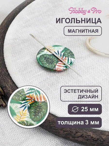 Игольница магнитная Hobby&Pro с красочной миниатюрой – удобная функциональная вещица и украшение вашего рабочего места. Игольница понравится всем любителям рукоделия, вышивания и шитья. Магнитная игольница легко удерживает иглу в процессе работы, также ею можно прикрепить схему к канве или к металлическому держателю. Разнообразие стильных современных дизайнов этих магнитов позволит подобрать магнит именно для вашего проекта и будет радовать вас на протяжении долгого времени. У вас устала рука во время работы или вам нужно взять на секунду ножницы - просто бросьте иглу на магнит, прикрепленный к канве, и он будет ждать вас для продолжения шитья. Следует обратить внимание, что встречаются иглы из нержавеющей стали, которые не магнитятся по своим свойствам. Все остальные иглы магнит будет с легкостью удерживать. Также рекомендуем фиксировать магнит на одном слое канвы. Большое количество слоев при подгибе по краям уменьшит степень фиксации иглы на магните. Размер игольницы: диаметр 25 мм, толщина 3 мм.