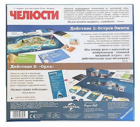 Настольная игра Ravensburger «Челюсти»увлекательная стратегическая игра по мотивам легендарного фильма«Челюсти». Культовый голливудский фильм отмечает в 2020 году своё 45-летие. Интрига и эмоции фильма переходят в формат настольной игры! Это незабываемое испытание! Краткая суть игры: Один игрок выбирает в качестве персонажа Акулу. Остальные игроки выбирают в качестве персонажей Квинта, шерифа Броуди и Хупера членов Экипажа, которым предстоит работать сообща, чтобы устранить Акулу. Игра состоит из двух действий, причем успех в Действии 1 обеспечивает преимущество в Действии 2. Также можно разыграть каждое действие по отдельности в качестве более короткой партии. Характеристики: Рекомендованный возраст: от 12 лет Количество игроков: 2-4 Время игры: 60 минут Игра полностью русифицирована