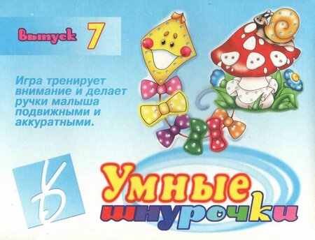 В серию "Умные шнурочки" входят выпуски разнообразных упражнений для малышей. Дети смогут правильно сгруппировать предметы по смыслу и пришнуровать их друг к другу, сосчитав их, создать узоры из цветной тесьмы. В игру-шнуровку "Умные шнурочки – 7" входит воздушный змей и мухомор из плотного картона, а также детали, которые необходимо пришнуровать при помощи 4х разноцветных шнурков, которые идут в комплекте. Игра тренирует внимание и делает ручки малыша подвижными и аккуратными. Желаем успехов! Размер фигурки воздушного змея: 22 х 16 см. Размер фигурки солнца: 18 х 16 см. Средний размер пришнуровываемой детали: 4,5 х 3 см. Длина шнурка 70 см.