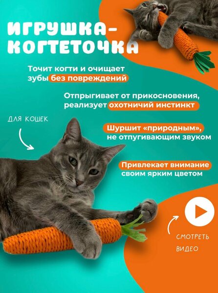Ела ли ваша кошка морковку? Точила ли когти об морковку? Нет? Теперь у неё есть такая возможность Это истинная правда. Экспериментальные образцы прошли испытания на 3х котах и ни один из них не пострадал. Пострадала только морковка - была покусана, поцарапана и прилично полетала по квартире А теперь серьезно. Игрушка-когтеточка, она же морковка - это прежде всего безопасное развлечение. Верхний слой игрушки полностью состоит из 100% натурального материала: листья кукурузы. Листья высушиваются специальным образом, а после из них изготавливается бумага, которая служит основным материалом для игрушки-когтеточки. Благодаря этому игрушку полезно грызть-улучшает гигиену полости рта-уменьшает риск возникновения болезни зубов. Об игрушку полезно точить когти-помогает сохранить мягкую мебель. А так же благодаря своему материалу дразнилка издаёт «природный» звук, напоминая питомцу о его инстинктах и при этом совершенно не пугая его. Ведь электронные звуки могут вселить страх животному. Игрушка лёгкая и неуловимая, при игре прытко отскакивает, что дополнительно раззадоривает питомца - развивает ловкость, реакцию, охотничий инстинкт, снимает стресс. Домашние кошки часто пугливы и долго привыкают к большой когтеточке. Маленькая когтедралка поможет приучить животное к процессу заточки когтей без лишнего стресса. Игрушка для собак, собак мелких пород? - Да, почему бы и нет! Идеальное решение для игр с домашними животными в отсутствие хозяев. Веселая игрушка погремушка для кота, кошки, котёнка? ⁃ Да, почему бы и нет! Шарик с колокольчиком внутри привлекает внимание. Это не просто товар для кошек, не просто когтеточка и кусалка - это лучший подарок вашему любимцу питомцу, который не позволит ему заскучать. Когтеточка с игрушкой морковка с хвостиком, морковка с фетровым хвостиком, морковка с бумажным хвостиком, заменит вам игровой комплекс для кошек, набор игрушек для котят, другие игрушки для кошки такие как: дразнилка для кошек, лазерная указка, мячик для кошки, рыба, мышка, интерактивная игрушка для кошек, мягкая игрушки для кошек и собак, удочка для кошек. Игрушка для кошек с погремушкой, она же мини когтеточка легко переносится с места на место. Ее можно брать с собой в дорогу, ставить там где стоит лежак для кошек, большая когтеточка домик для кота, домик для кошки, где стоит картонная когтеточка, когтедралка, где находится любимая мягкая игрушка для котёнка. Сумка женская может вместить в себя нашу лёгкую, компактную, ЭКО когтеточку Игрушка морковка идёт в 2х видах. Первый : оранжевая бумага, зелёная бумага (хвостик), погремушка внутри. Второй: оранжевая бумага, зелёный фетр (хвостик), колокольчик внутри. Хвостик абсолютно не меняет функцию игрушки и когтеточки вся основная шуршащая поверхность для кошки это плотная оранжевая прессованная бумага напоминающая папье маше Кот, кошка, котёнок, собака, даже интерактивный кот робот не устоит, и проходя мимо нашего товара для животных, игрушки для животных, дразнилки для домашних животных, подтолкнет лапкой экологичную дразнилку для кошек Кошки точат когти о специальные поверхности: когтедралки из картона, когтедралки из бумаги, когтедралка картонная. Но в отличии от джута - бумага служит ещё и зубочисткой для кошек, очищает зубы котят, дарит уход за зубами и дёснами и плюс отвлекает животное от м
