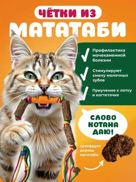 Отгадайте загадку, дорогие наши любители животных! - Не кошачья мята, но успокаивает, не игрушка когтеточка, но когти точет, не удочка для кошек, но забавляет и в форме держит. Что же это? Вы, конечно, предположите - интерактивная игрушка для кошек. Но батареек в ней точно нет, зато у Вашего хвостатого точно будет заведена «батарейка» Сдаетесь? Ладно, не станем томить, ведь подобной дразнилки для кошек на рынке еще не было. Это палочки мататаби, да не простые, а в виде чёток. Для чётких котиков, так сказать Да, да! Мы всегда топим за экологию! Девиз нашего бренда: забота о ваших питомцах в активной игре. Поэтому мы создаем только то. что можно давать даже маленьким котятам. В отличии от шарика мяты и валерьяны чётки из мататаби не вызывают перевозбуждения нервной системы и повышенной агрессивности. Они активно переключают на себя внимание от пакостных мероприятий в квартире и успокаивают при переездах и поездках в ветклинику. Лучшей игрушки для котят не найти. Ко всему прочему палочки мататаби обеспечивают чистку зубов, стимулируют смену молочных зубов и формирует правильный прикус у котят, а экологически чистые и натуральные материалы делают игрушку абсолютно безопасной для питомцев-аллергиков. Ну не игрушка, а чистое золото. Просто набор палочек для зубов удовлетворяет лишь гигиенические потребности животного, наши чётки товар для кошек 2 в 1. Гигиена + игра в одном флаконе. Хлопковые нити на которых закреплены деревянные брусочки вызывают «озверительные» эмоции у муррчащих клиентов. Животным легко обхватывать четки лапками, грызть, впивать в них когти, возить и катать по полу. Вам не надо будет управлять игрушкой, как вы делаете это обычно с лазерной указкой или мячиком. Положите перед котом чётки и любуйтесь его активностью. Реакция будет не хуже чем на мышек погремушек - это мы обещаем! Ни один набор игрушек для кота не сможет принести столько пользы сколько наши чётки из японского дерева - мататаби.