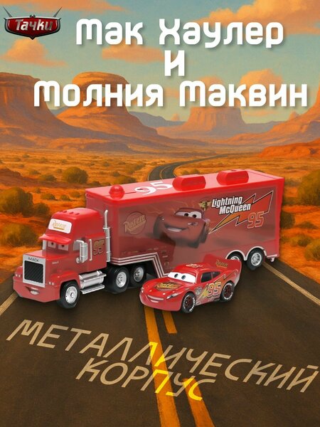 Трейлер Мак Хаулер в комплекте с машинкой "МакКуин" из серии "Тачки" - главный герой из одноименного мультипликационного фильма. Известный гоночный автомобиль, который узнает, что в жизни есть нечто большее, чем просто гонки и победы, после короткого, но изменившего его жизнь пребывания в отдаленном городке Радиатор-Спрингс, в котором он застрял после того, как заблудился по дороге в Калифорнию. Трейлер Мак Хаулер у которого передняя часть автомобиля сделана из металла, а часть отсека из пластика. Есть возможность открыть прицеп и поместить туда машинку (предварительно убедитесь что машинка подходит по размеру, чтобы избежать застревания). Размер трейлера: 22см*5см*7см. Коллекционная машинка Тачки Герои мультфильмов МакКуин - это отличный подарок для мальчиков и даже девочек на Новый год, День Рождения, начало учебного года или любой другой праздник, игрушка станет отличным дополнением для коллекции.