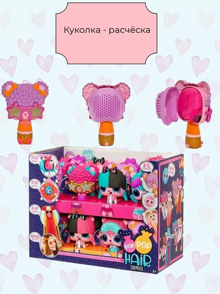 Набор Pop Pop Hair - это игрушка 3 в 1. Он состоит из: расчески с бутылочкой-спреем, роллера, питомца с волосами, 2 заколок для волос питомца, 4 резиночек для волос питомца, 1 большой резинки для волос. - Чтобы внимательно изучить содержимое набора, необходимо открыть расческу, таящую множество сюрпризов. Ручка расчески также является бутылочкой с распылителем, ее следует наполнить водой. Верхушка расчески пригодится для плетения косичек. - Внутри расчески находятся резинки и заколки для питомца, собранные в пакетик. - Чтобы добраться до миниатюрной фигурки зверька, необходимо сбрызнуть узелок веревки, которой завязан мешочек, водой и дождаться, пока он растворится, тогда внутри роллера удастся обнаружить фигурку питомца. - Питомца также можно использовать в качестве топпера для карандаша или для декорирования волос. Создавайте необычные прически и яркие косички вместе с Pop Pop Hair Surprise. Рукоятка расчески в виде очаровательной куколки отсоединяется и превращается во флакон с разбрызгивателем. Нужно нанести жидкость на упаковку, чтобы она открылась. Внутри находится валик, на который намотана прядь волос. А внутри еще есть питомец, который сделан в виде топпера для карандаша. В наборе: