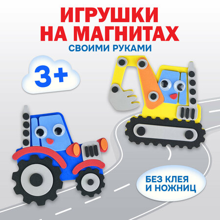 Игрушки на магнитах – это аппликация и поделка в одном наборе для увлекательной игры и развития малышей от 3 лет. В наборе для поделок вы найдете все необходимое для создания двух игрушек на магнитах своими руками. Наш новый набор для творчества «Транспорт. Спецмашины» понравиться любому мальчишке! Крупные фигурки отлично подойдут для маленьких ручек, малыш может прикрепить их на любую металлическую поверхность, играть с ними на столе или взять с собой в дорогу. Магнитные аппликации для детей изготовлены из безопасных гипоаллергенных материалов: фигурки выполнены из картона, а украшать их нужно деталями из современного объёмного полимерного материала ЭВА — безопасного, экологически чистого, не вызывающего аллергии, простого в использовании и приятного на ощупь. На готовую поделку с обратной стороны нужно приклеить магнитный винил, который также входит в набор для творчества. Некоторые детали покрыты блестящей голографической пленкой, что придает фигуркам яркость и сияние. Игрушки можно повесить на холодильник, магнитную доску или любую другую металлическую поверхность. Игрушки на магнитах подходят для сюжетно-ролевых игр. В процессе работы над аппликацией развивается мелкая моторика рук, зрительное и сенсорное восприятие, внимание и усидчивость. Аппликация является отличным средством для развития творческих и интеллектуальных способностей у ребёнка. Возраст: 3−7 лет. В наборе: 2 фигурки из картона, детали из цветного мягкого пластика ЭВА на самоклеящейся основе, пластмассовые глазки, магнитный винил. Размер игрушки: примерно 12х12 см Размер упаковки: 20х22х1 см.