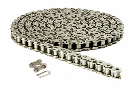 Цепь IRIS 5м 80-1 IR (DIN 12A-1, ПР-25,4-60) - отрезок 5 метров в комплекте с соединительным звеном. Используется в различных промышленных приводных системах, обеспечивает высокую производительность даже в самых тяжелых условиях. Пластины цепи проходят дробеструйную обработку, что существенно повышает надежность и срок службы, а первоначальное растяжение способствует более высокой усталостной прочности. Все компоненты подвергаются термообработке согласно применению. Для повышения защиты применяется специальная исходная смазка. Отрасли применения: станкостроение, тяжелое машиностроение, металлургия, конвейерные системы пищевой промышленности, упаковочная техника, сельское хозяйство. При замене цепи рекомендуется замена приводных ведущих и ведомых звезд. Материал изготовления: углеродистая сталь C45. Не подлежит обязательной сертификации. Соответствует требованиям ISO, DIN, ANSI и BS. Тип: приводная цепь. Количество рядов: 1 шт. Покрытие: без покрытия. Материал: сталь. Диаметр ролика: 15.88 мм. Диаметр пальца: 7.92 мм. Шаг звеньев: 25.4 мм. Ширина внутреннего звена: 15.75 мм. Высота пластины: 24 мм. Длина пальца: 32.7 мм. Длина замыкающего пальца: 35 мм. Стандарт: ISO 16A-1 (ANSI/ASA 80). Вес нетто: 13 кг. Габариты без упаковки: 300х300х30 мм. Комплектация: Цепь 80-1 (5 метров), Соединительное звено цепи 80-1.