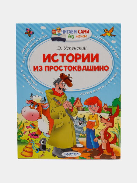 Весёлая книга "Истории из Простоквашино" Э. Успенского отлично подходит для первого самостоятельного чтения. Ведь в этом сборнике удобного формата коротенькие сказочки, большие буквы, слова с ударениями и много цветных иллюстраций. Книжки серии "Читаем сами без мамы" можно легко брать с собой в дорогу, на прогулку и читать вместе с друзьями.