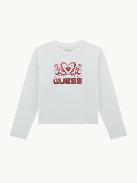 Лонгслив GUESS Midi LS, размер 14 лет, белый - это стильный и комфортный вариант для юных модников. С лакшери принтом, декорированным сердцем и логотипом GUESS, он станет ярким акцентом в гардеробе вашего ребенка.