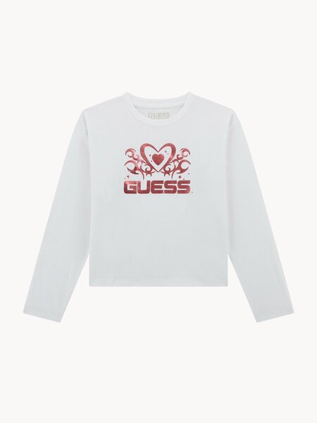 Лонгслив GUESS Midi LS, размер 14 лет, белый - это стильный и комфортный вариант для юных модников. С лакшери принтом, декорированным сердцем и логотипом GUESS, он станет ярким акцентом в гардеробе вашего ребенка.
