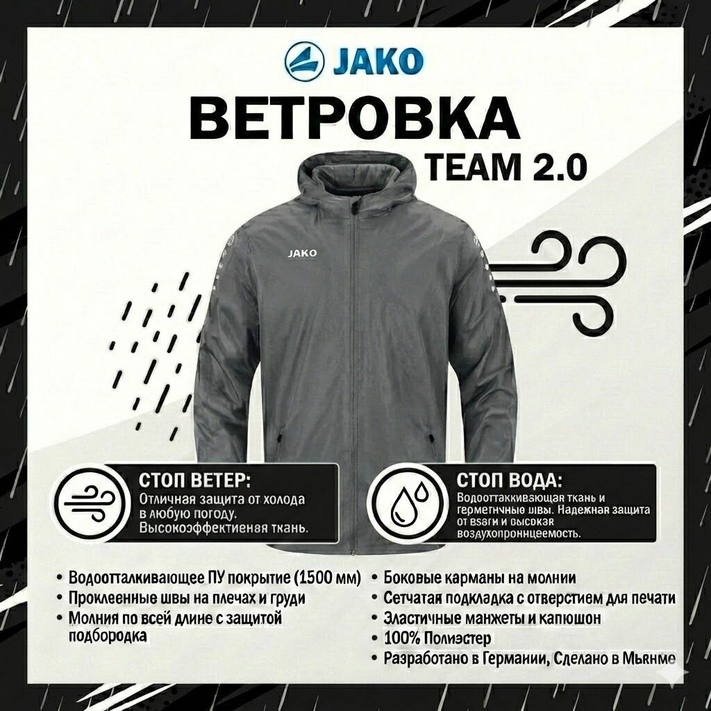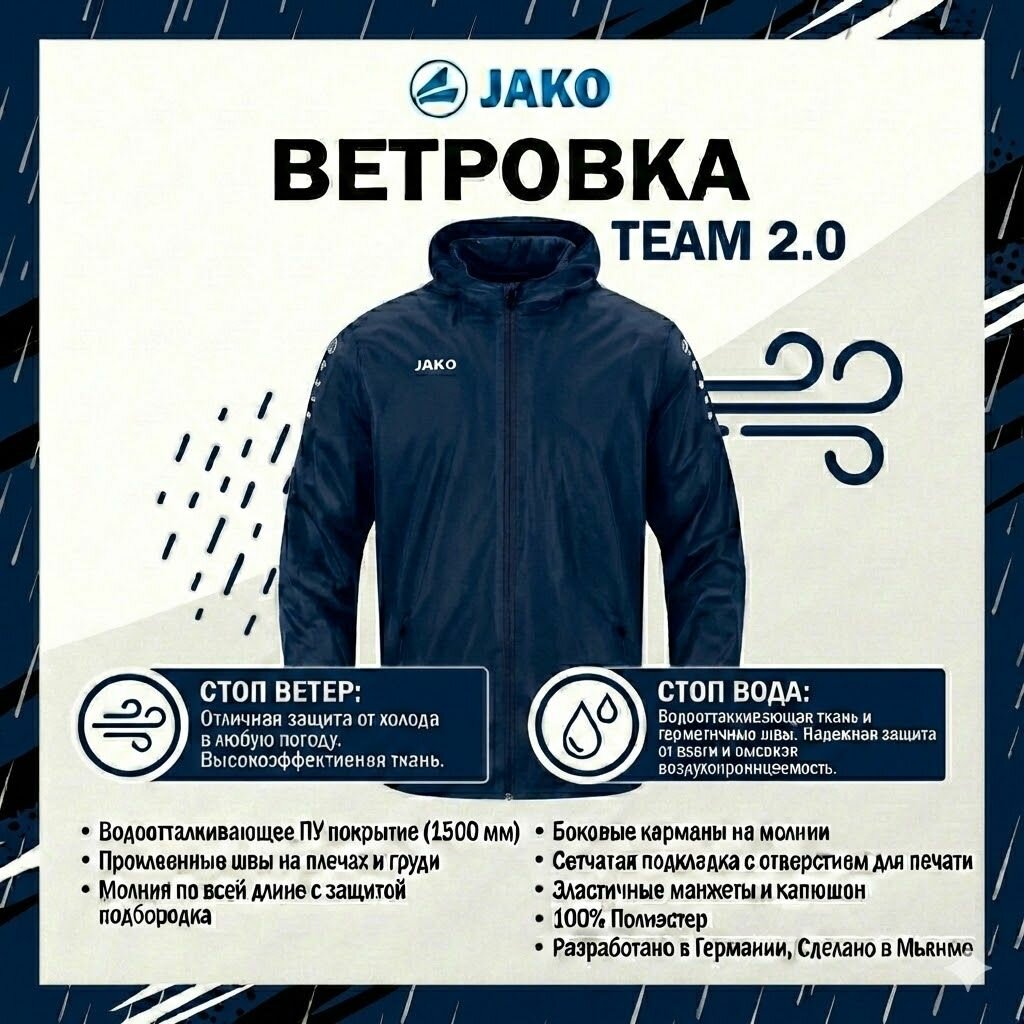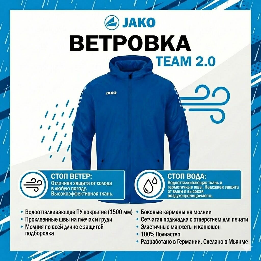 Ветровка RAIN JACKET TEAM 2.0 от компании JAKO произведена из высококачественного полиэстера с применением технологий STOP WIND и STOP WATER. STOP WIND - защищает организм исключительно от переохлаждения благодаря эффекту ветрозащиты. Функциональная ткань предоставляет высочайшую защиту в любую погоду. STOP WATER - водоотталкивающие функциональные ткани и герметичные швы обеспечивают надежную защиту от влаги. Высокая паропроницаемость гарантирует здоровый и комфортный микроклимат тела. Водоотталкивающая оболочка с полиуретановым покрытием ( 1500 мм ПУ). Ткань отличается высокой эластичностью, а также не стесняет движений во время активных действий. Данная модель по всей длине застегивается на застежку-молнию, которая имеет специальный "гараж", чтобы избежать случайного защемления горла или подбородка. Имеются боковые карманы на молнии для хранения важных мелочей. Капюшон не убирается, имеет две стягивающие манжеты. На груди и на плечах швы проклеены. Сетчатая подкладка с отверстием для печати. Манжеты с эластичной вставкой. Состав: 100% - полиэстер. Произведено в Мьянме. Родина бренда - Германия.
