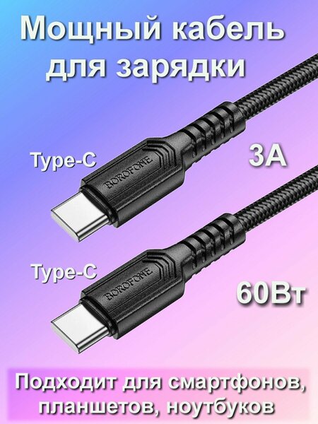 Кабель Borofone BX116 Type-C - Type-C Certain предназначен для зарядки и передачи данных. Поддерживает быструю зарядку телефонов, планшетов, ноутбуков и других устройств с интерфейсом Type-C и мощностью 60W. Позволяет обмениваться информацией между гаджетами и ноутбуком, персональным компьютером. Нейлоновая оболочка предохраняет кабель от заломов и кручения, продлевая срок его службы. Характеристики: Максимальный ток нагрузки: 3А; Максимальная мощность: 60W; Длина: 1м; Материал проводника: медь: Материал оболочки: нейлон.