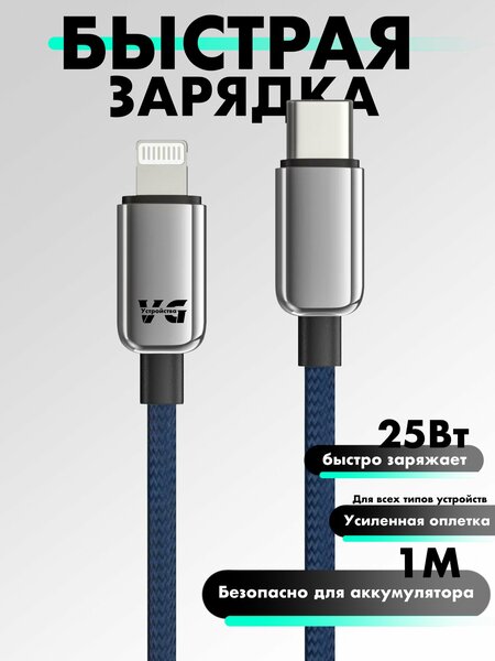 Кабель быстрой зарядки для iPhone, Type-C - Lightning, iPhone, 25W 3A, темно-синий - это отличный выбор для тех, кто хочет быстро зарядить свой телефон или планшет и передавать данные между устройствами. Он поддерживает стандарт быстрой зарядки Fast Charge 2.0, имеет двойное экранирование и может заряжать устройства до 2.4А.