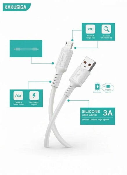 Силиконовый дата-кабель KAKUSIGA — это удобный, гибкий и прочный кабель, обеспечивающий быструю зарядку и стабильную передачу данных. Силиконовое покрытие защищает кабель от изгиба, поломки и усталости, а также поддерживает быструю зарядку током 3 А. Преимущества: • Максимальная выходная мощность 3 А — высокоскоростная передача энергии • Термо- и огнестойкий силиконовый материал • Морозоустойчивость — работает даже при перепадах температур • Гибкий и прочный — не ломается при сгибании • Умный чип — безопасное управление питанием • Мягкий пищевой силикон — безопасен для здоровья • Разъём USB — Micro — широкая совместимость ⸻ Характеристики: • Модель: силиконовый кабель USB — Micro • Выходная мощность: 3 А (макс.) • Длина: 1 метр • Материал: силикон • Совместимость: устройства с разъёмом Micro USB (Samsung, Xiaomi, Huawei, внешние аккумуляторы, колонки и т. д.) • Цвет: белый • Производитель: Guangzhou Huihuang Electronics Co, Ltd • Страна происхождения: Китай (Сделано в Китае) ⸻ Совместимые устройства: • Смартфоны на Android (Samsung, Xiaomi, Huawei, Oppo, Realme) • Внешний аккумулятор, Bluetooth-гарнитура, колонка, планшет