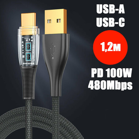 Кабель PALMEXX USB-A to USB-C, PD 100W, длина 1.2м, чёрный