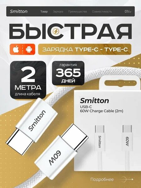 Кабель Type C - Type C Smitton 2м, быстрая зарядка для телефона Samsung 2 метра, шнур для Xiaomi Cамсунг iPhone Huawei - это идеальный выбор для тех, кто хочет быстро и эффективно заряжать свои устройства. Этот кабель поддерживает быструю зарядку, что позволяет вам экономить время и не ждать долгое время, пока ваш телефон или планшет будут полностью заряжены. Кабель имеет длину 2 метра, что делает его удобным для использования в любом месте. Он также поддерживает интерфейс Apple 30-pin, что позволяет использовать его с устройствами Apple. Кабель Smitton изготовлен из высококачественных материалов и прошел все необходимые тесты на безопасность и качество. Он имеет длину 2 метра, что делает его удобным для использования в любом месте. Он также поддерживает интерфейс Apple 30-pin, что позволяет использовать его с устройствами Apple. Кабель Smitton имеет длину 2 метра, что делает его удобным для использования в любом месте. Он также поддерживает интерфейс Apple 30-pin, что позволяет использовать его с устройствами Apple. Он имеет высокую скорость передачи данных и поддерживает быструю зарядку, что делает его идеальным выбором для тех, кто хочет быстро и эффективно заряжать свои устройства.