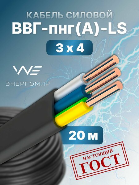 Силовой электрический кабель(провод) ВВГ-пнг(А) -LS 3х4 ГОСТ Энергомир, 20м. Продукция компании "энергомир" - кабели и провода высочайшего качества. Изготовлены в строгом соответствии с ГОСТ. Расшифровка маркировки: В - изоляция жил из поливинилхлоридного пластиката В - оболочка из поливинилхлоридного пластиката Г - отсутствие защитного покрова нг - не распространяет горение при групповой прокладке (А) - категория по исполнению в части показателей пожарной безопасности LS - низкое дымо- и газовыделение Low Smoke П - плоский, жилы расположены в параллельно друг другу Применение: Кабели предназначены для передачи и распределения электроэнергии в стационарных установках на номинальное переменное напряжение 0,66 или 1 кВ частотой 50 Гц. Для прокладки с учетом объема горючей нагрузки во внутренних электроустановках, а также в зданиях, сооружениях и закрытых кабельных сооружениях. Для электропроводок в жилых и в общественных зданиях. Кабели могут быть проложены в строительных конструкциях зданий и сооружений, в сухих, влажных и сырых помещениях, внутри и снаружи кирпичных или бетонных стен, за исключением прямой заделки в сырой бетон.