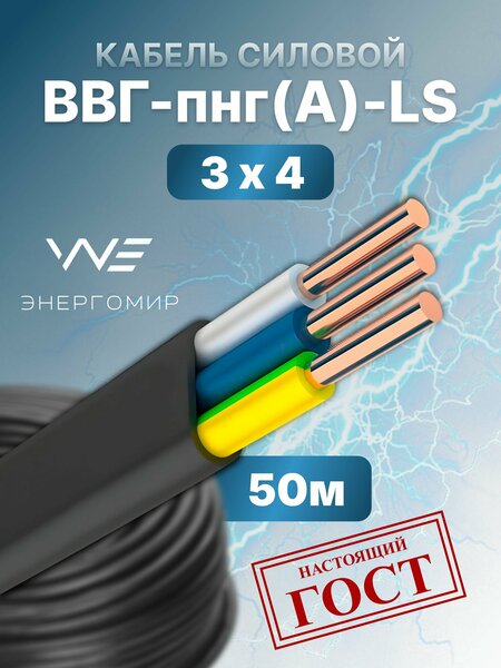 Силовой электрический кабель(провод) ВВГ-пнг(А) -LS 3х4 ГОСТ Энергомир, 50м. Продукция компании "энергомир" - кабели и провода высочайшего качества. Изготовлены в строгом соответствии с ГОСТ. Расшифровка маркировки: В - изоляция жил из поливинилхлоридного пластиката В - оболочка из поливинилхлоридного пластиката Г - отсутствие защитного покрова нг - не распространяет горение при групповой прокладке (А) - категория по исполнению в части показателей пожарной безопасности LS - низкое дымо- и газовыделение Low Smoke П - плоский, жилы расположены в параллельно друг другу Применение: Кабели предназначены для передачи и распределения электроэнергии в стационарных установках на номинальное переменное напряжение 0,66 или 1 кВ частотой 50 Гц. Для прокладки с учетом объема горючей нагрузки во внутренних электроустановках, а также в зданиях, сооружениях и закрытых кабельных сооружениях. Для электропроводок в жилых и в общественных зданиях. Кабели могут быть проложены в строительных конструкциях зданий и сооружений, в сухих, влажных и сырых помещениях, внутри и снаружи кирпичных или бетонных стен, за исключением прямой заделки в сырой бетон.