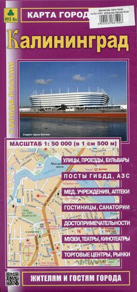 Калининград. Карта города. Двусторонняя полноцветная карта. Содержит подробный план города со всеми улицами, номерами угловых домов. Указано расположение административных зданий и социально-культурных объектов. Имеется указатель улиц. Масштаб города 1:50 000. Формат 495х695 мм