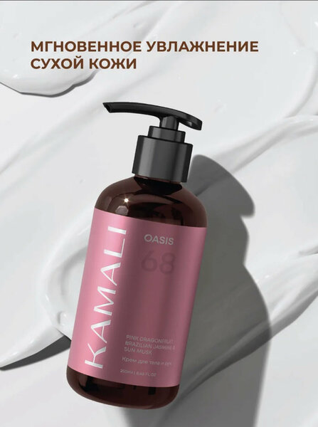 KAMALI OASIS 68 — крем для тела и рук, 250 мл Интенсивное средство для ухода за сухой кожей. Формула с экстрактом питахайи, бразильским жасмином и солнечным мускусом мгновенно увлажняет и питает кожу, придаёт ей мягкость и эластичность. Лёгкая текстура быстро впитывается, не оставляя липкости, и дарит ощущение свежести и комфорта. Подходит для ежедневного применения, помогает поддерживать естественный баланс кожи.
