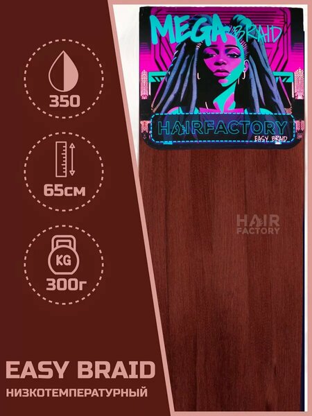 Новинка сезона - новая линейка канекалонов для волос Easy Braid (изи брейд) - MEGA BRAID однотонный от производителя. Длина искусственных волос - 65 см при весе 300г. Все канекалоны Easy Braids гофрированные. Данная модель является премиальной и используется для плетения косичек, изготовления дред, зизи, афрокос, боксерских, сенегальских и гавайских косичек. Канекалон изготовлен из искусственного волокна, который имитирует натуральные волосы. Обратите внимание, что данная модель сводится к тонкому концу, что позволяет сразу вплетать его в прическу. Материал прост в использовании, подходит для безопасного наращивания. На странице нашего бренда вы можете найти весь ассортимент нашего бренда - HAIR Factory, от резинок для волос, до канекалонов Easy Braid однотонных и цвета омбре. Порадуйте себя и вашего ребенка модным аксессуаром для волос.