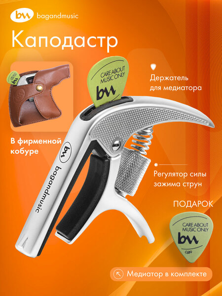 Каподастр bm – незаменимый аксессуар для гитаристов всех уровней мастерства. Наш фирменный каподастр bm в кобуре на ремень – это удобство и комфорт в одном. Он идеально эргономичен и удобно лежит в руке. Благодаря инновационному дизайну, он легко крепится на ремень, что позволяет всегда иметь его под рукой во время игры, на репетициях и концертах. Одним из основных преимуществ нашего каподастра bagandmusic является наличие медиатора в комплекте. На каподастре имеется прорезиненный разъем для него. Теперь вам не нужно искать отдельно медиаторы – они всегда будут под рукой, готовые к использованию. Это позволяет сэкономить время и облегчить процесс подготовки к исполнению любимых мелодий. Наш каподастр оснащен усиленной пружиной с доводчиком на винтовом механизме. Это гарантирует надежное и плотное крепление на грифе гитары, исключая возможность случайного соскальзывания во время игры. Доводчик позволяет тонко регулировать степень зажатия лада и долго сохраняет нужную степень зажима, сохраняя идеальное интонационное звучание каждой ноты. Каподастр BAG&music в кобуре на ремень – это прекрасное сочетание стиля, удобства и высококачественной функциональности. Он идеально подходит для профессиональных музыкантов, которые ценят каждую деталь своего инструмента, а также для начинающих, желающих получить максимальное удовольствие от игры на гитаре.